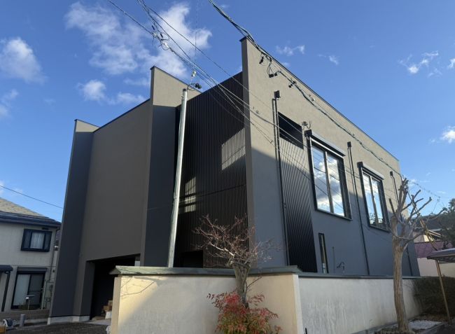 2025/12/23 まもなく完成・お引き渡しを迎える住宅現場の様子です。落ち着いた色合いと直線的なデザインの外観。おしゃれで引き締まった雰囲気の仕上がりとなりました。現在は最終的な仕上げ、清掃作業を進めており、丁寧に検査を繰り返しています。お施主様に安心して新生活を迎えていただきたいと思います。