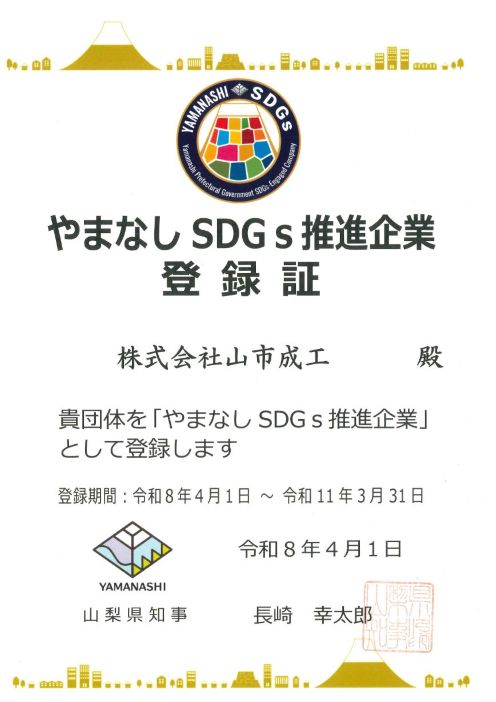 このたび、やまなしSDGs推進企業として再登録されました。日頃より取り組んできた環境配慮や地域社会への貢献、安全で持続可能な体制構築が評価されたものと感じております。これからも建設業を通じて地域に根ざし、未来につながる取り組みを大切にしながら、一つひとつの仕事に誠実に向き合ってまいります。引き続き、皆さまに信頼いただける企業を目指して努めてまいります。