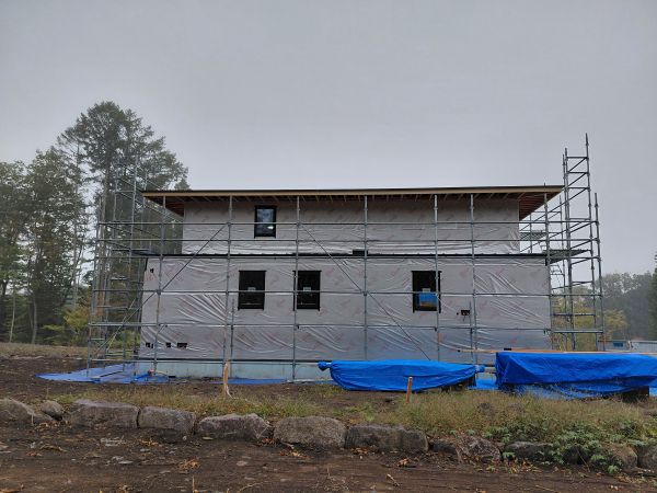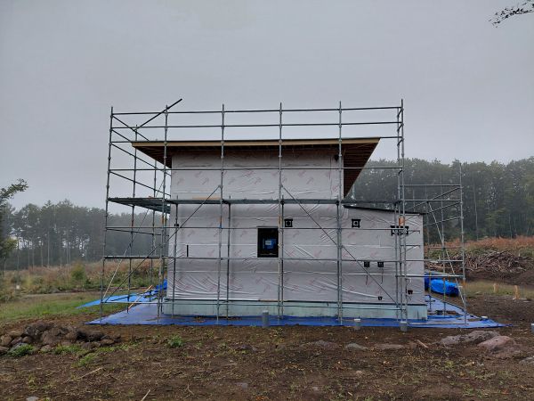 北杜市内で進められている木造住宅新築工事現場です。外壁下地の防水シートをの施工が終わった様子です。建物全体をしっかりと保護する重要な工程です。雨水の侵入を防ぎ、耐久性を高めるため、丁寧な施工が求められます。今後は外装仕上げや内部工事へと進み、完成に向けて一歩ずつ作業を進めていきます。快適で安心して暮らせる住まいとなるように丁寧に取り組んでいます。