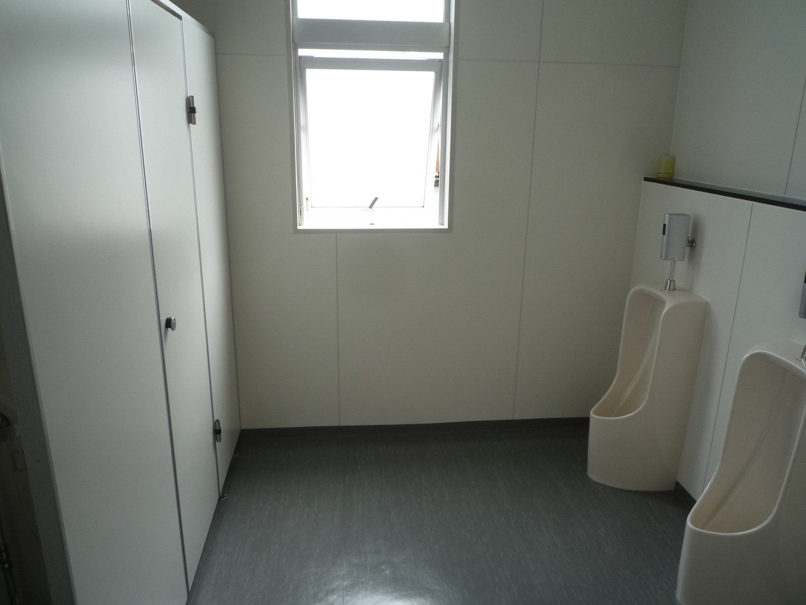 企業様のトイレのリフォームをさせて頂きました。床に長尺シートを張り、壁はケイ酸カルシウム板下地に抗菌塗装。便器とトイレブースを新たに設置しました。