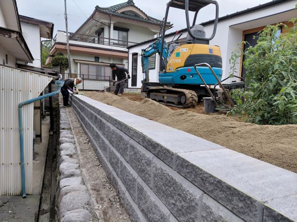 韮崎市内にて現在、住宅の敷地境界で乾式型擁壁ブロックを使用した擁壁工事を行っています。